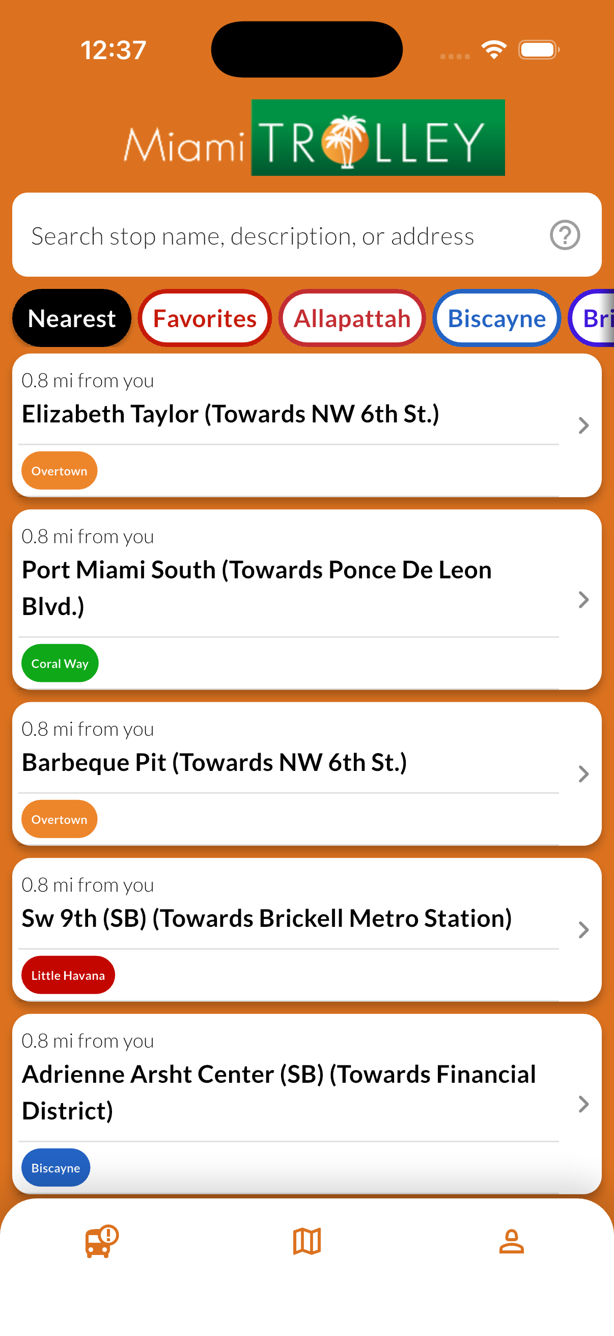 Desde paradas cercanas y tiempos de llegada en vivo hasta mapas de rutas y favoritos, así se ve Miami City Trolley Tracker en uso.